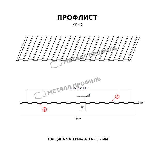 Профиль МП-10:Один из популярных в Нижнем Новгороде видов профнастила категории «стеновой». Он отличается низкой высотой волны – 10 мм и симметричным рисунком. пропорциям, МП-10 имеет широкую сферу применения. Чаще всего этот профнастил востребован для постройки стен и перегородок, обшивки фасадов жилых и коммерческих зданий, возведения заборов, а также как материал подвесного потолка в промышленных сооружениях. Для производства указанного профиля берётся высококачественная холоднокатаная сталь 0,4-0,7 мм толщиной. Металлическая основа покрывается цинком, а также обрабатывается полимерным составом. Протекторное полимерное покрытие удачно дополнит цветовую палитру вашего объекта. К тому же оно обеспечит изделию дополнительную защиту от влажности, выгорания, механических воздействий.
